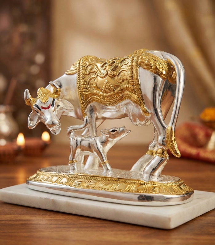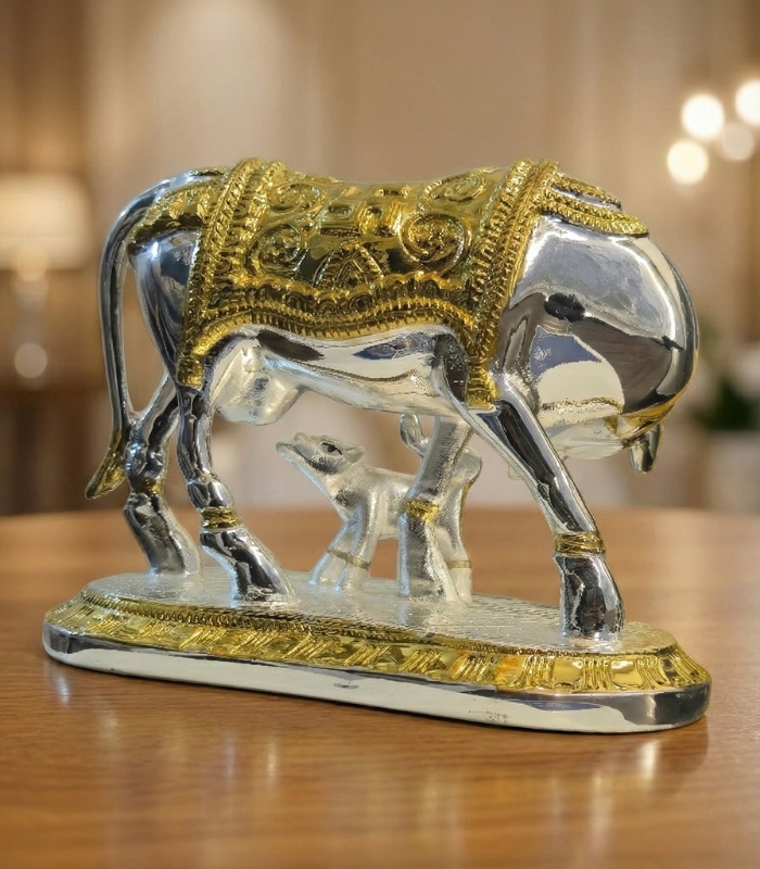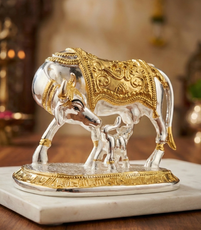 Kamdhenu Cow with Calf Idol – Gold & Silver Plated